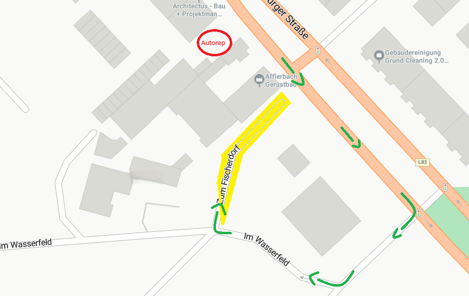 Das rot markierte Gebäude auf dem Bild stellt unsere Werkstatt sowie unseren Teilehandel dar. Die gelb markierten Flächen zeigen die Parkmöglichkeiten auf. Bitte beachten Sie, dass diese Parkplätze nicht privat sind. Wir bitten Sie daher dringend, keine anderen Fahrzeuge zu blockieren. Um von unserer Werkstatt zu den Parkplätzen zu gelangen, folgen Sie bitte den grün markierten Pfeilen.